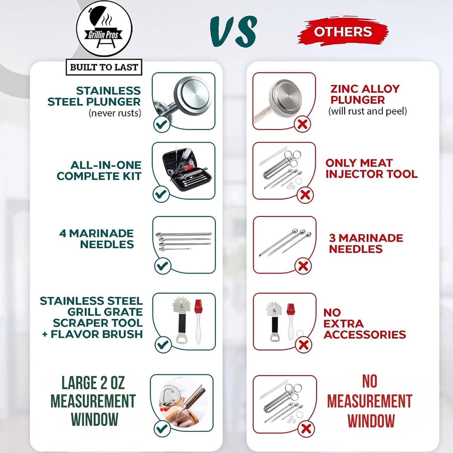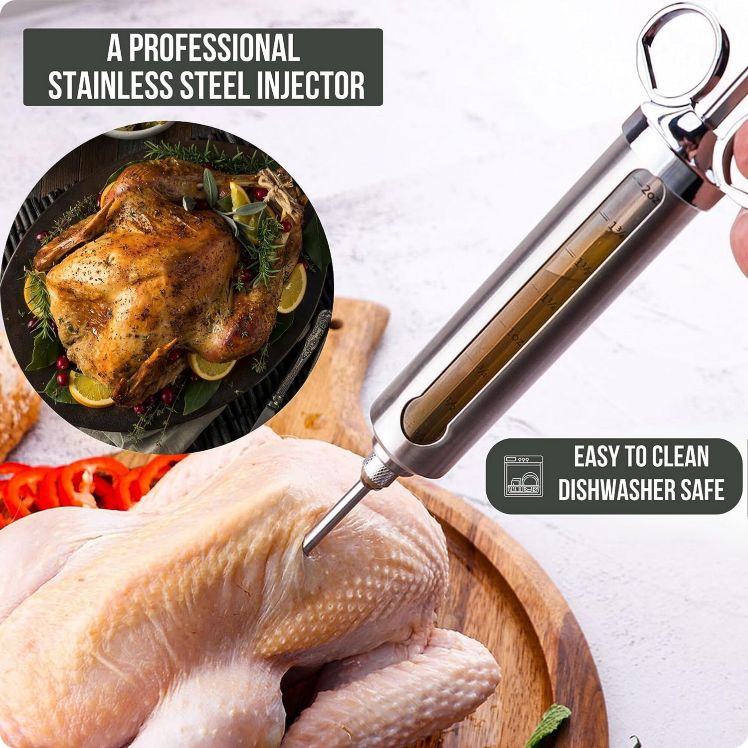 - This comprehensive set includes a stainless steel food injector with a built-in measuring window for precise marinade distribution, along with four anti-clog needles to tackle any type of meat.